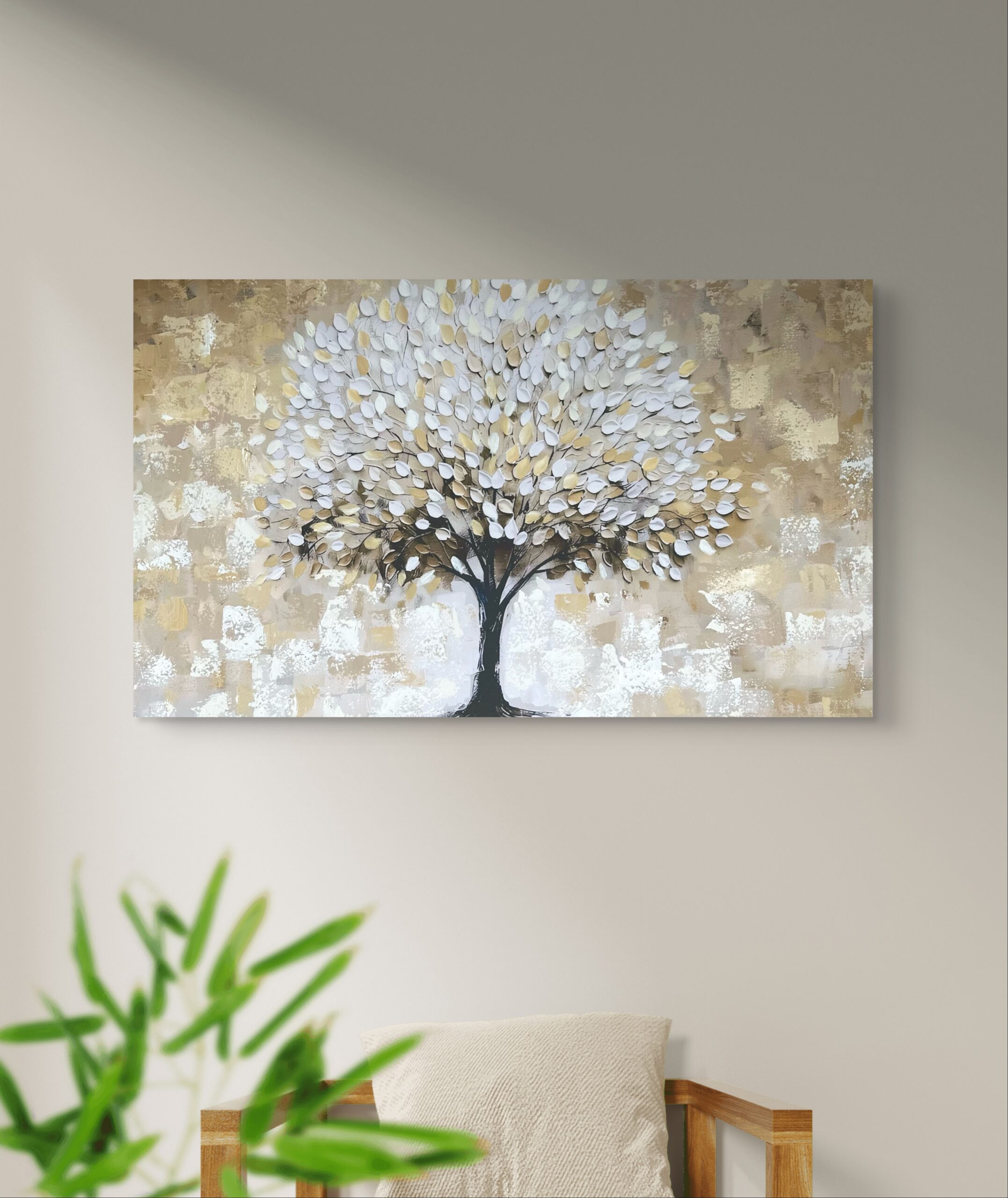 Perfecto para: Añadir un toque de sofisticación, luz y prosperidad a su sala, dormitorio u oficina. Su paleta de colores neutros armoniza sin esfuerzo con cualquier estilo de decoración, desde el minimalista hasta el clásico. ¡Una obra que irradia calma y lujo silencioso!