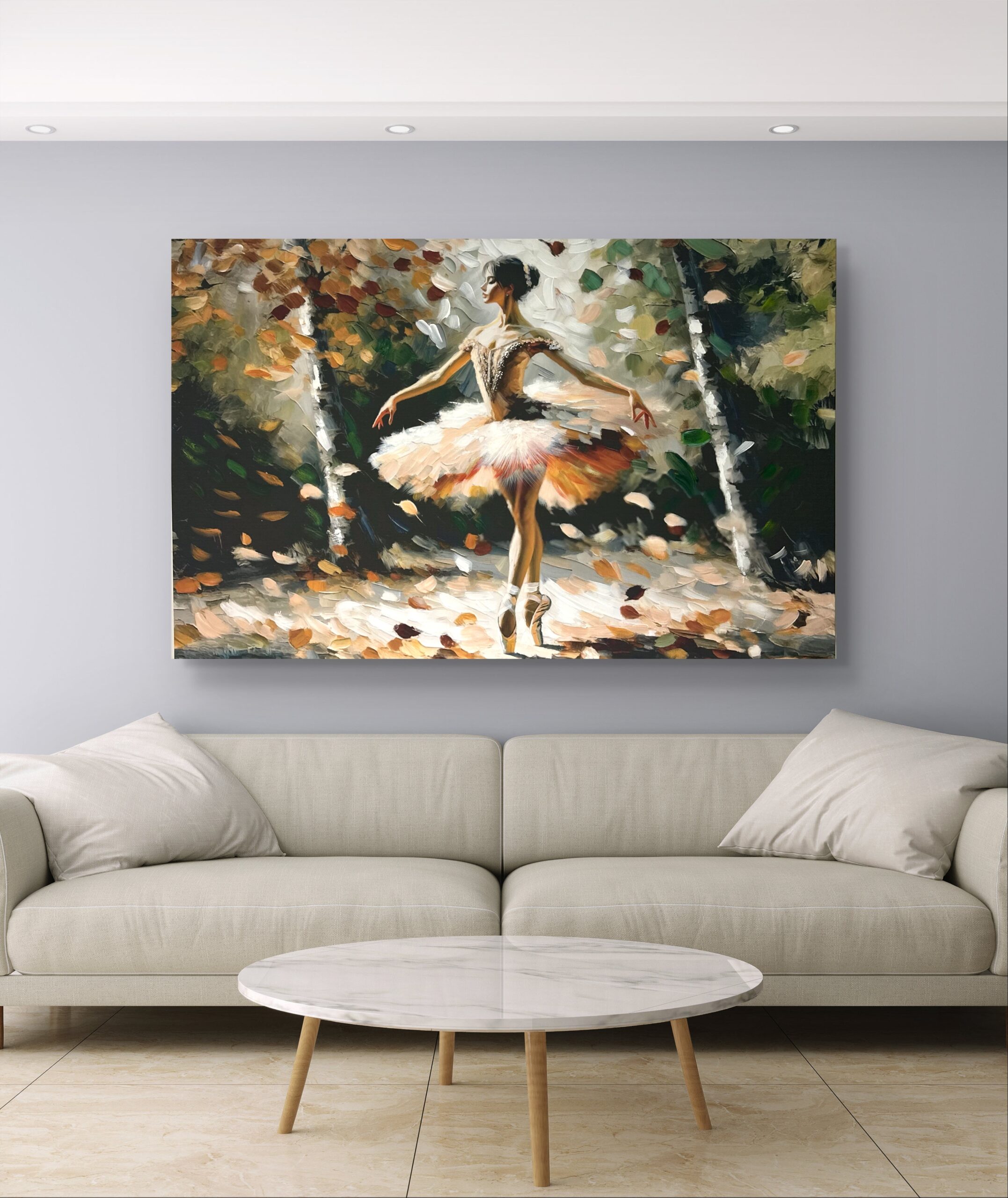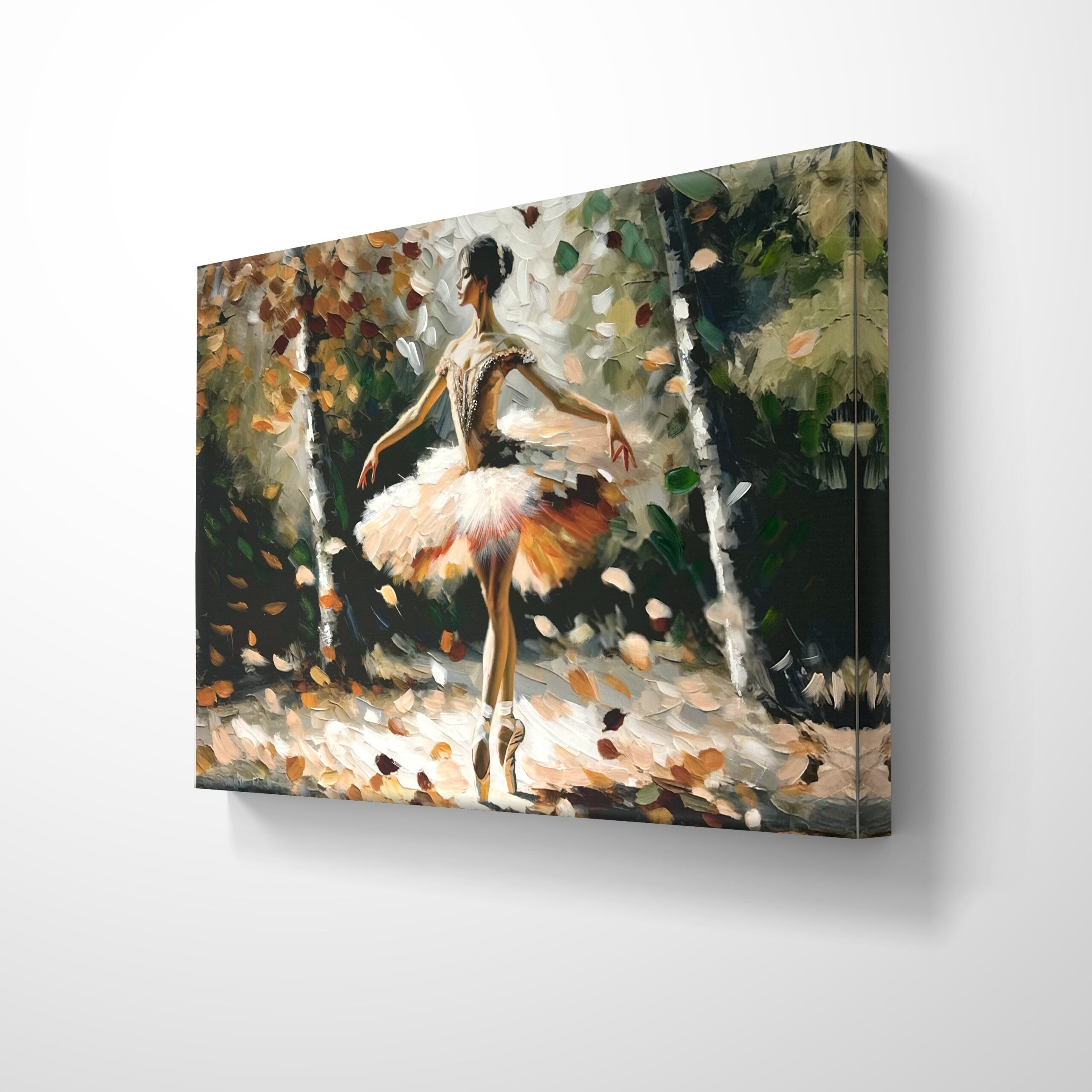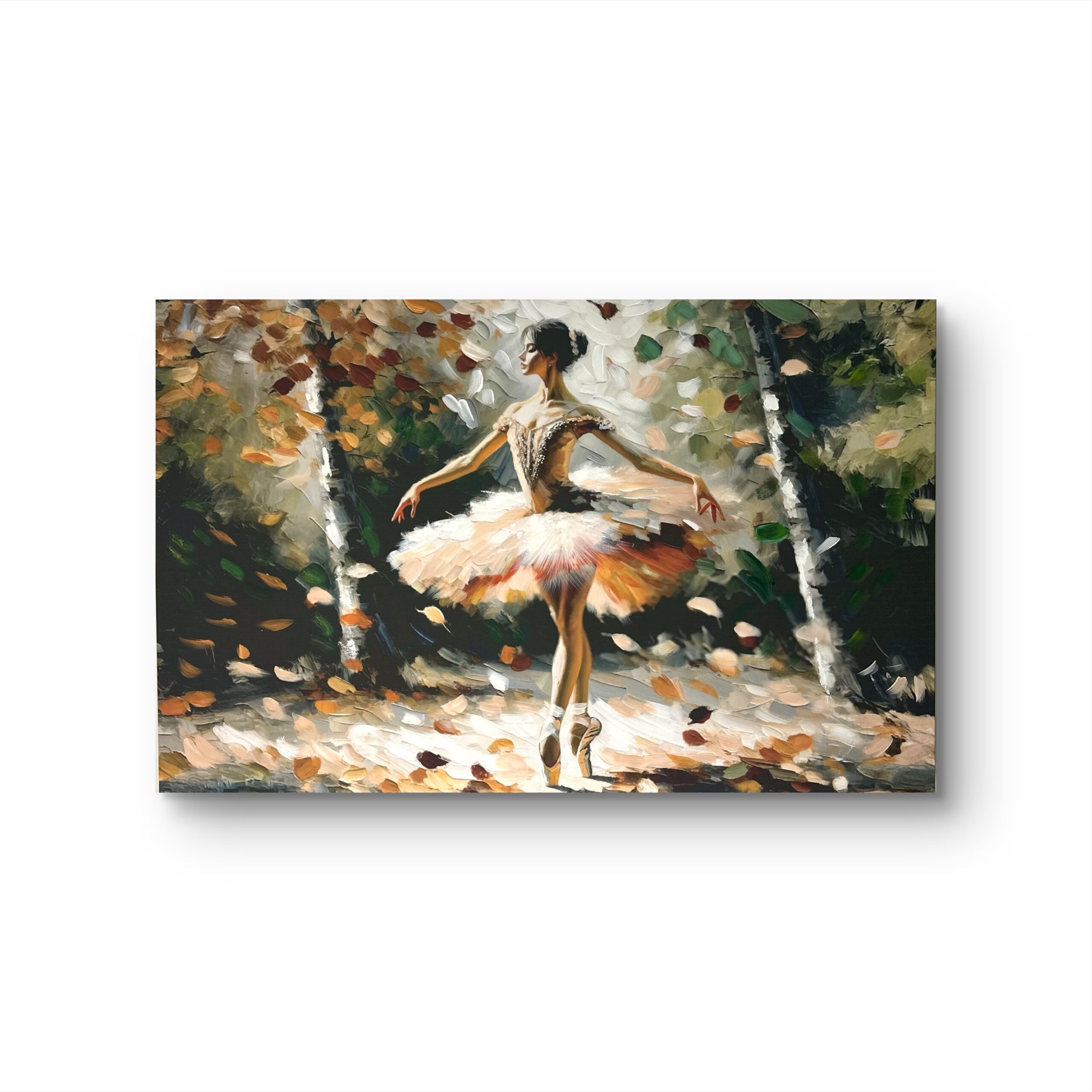 Una elegante bailarina en puntas en un ambiente otoñal. Una obra que celebra la forma humana, la naturaleza y la emoción a través del color y la textura.