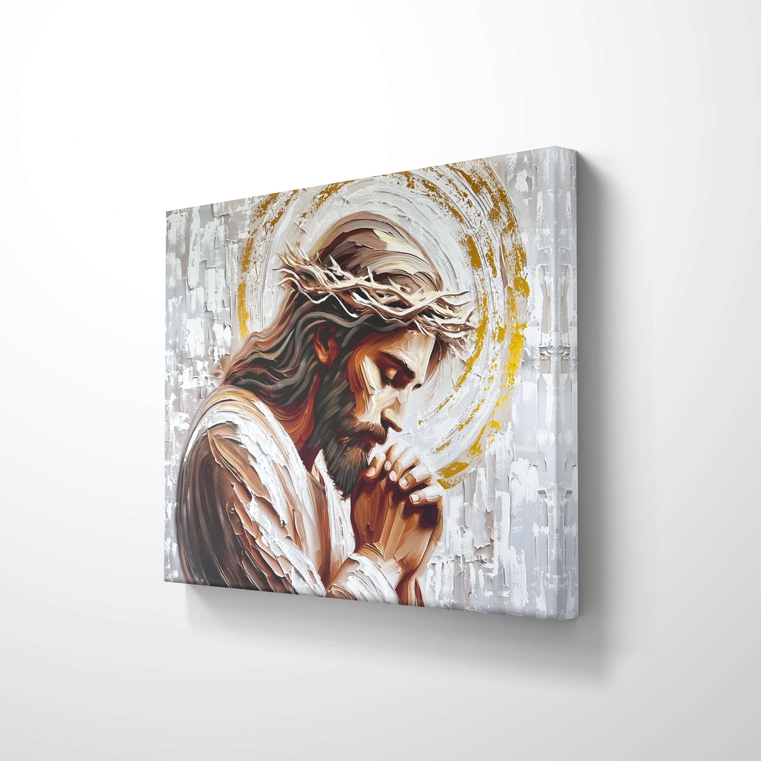 Este hermoso cuadro de Jesús en oración transmite mucha paz. Tiene textura con espátula y pintura dorada brillante en la aureola lo cual lo hace ver muy especial. Es una imagen de fe, devoción y esperanza perfecta para darle un toque espiritual y cálido a tu casa