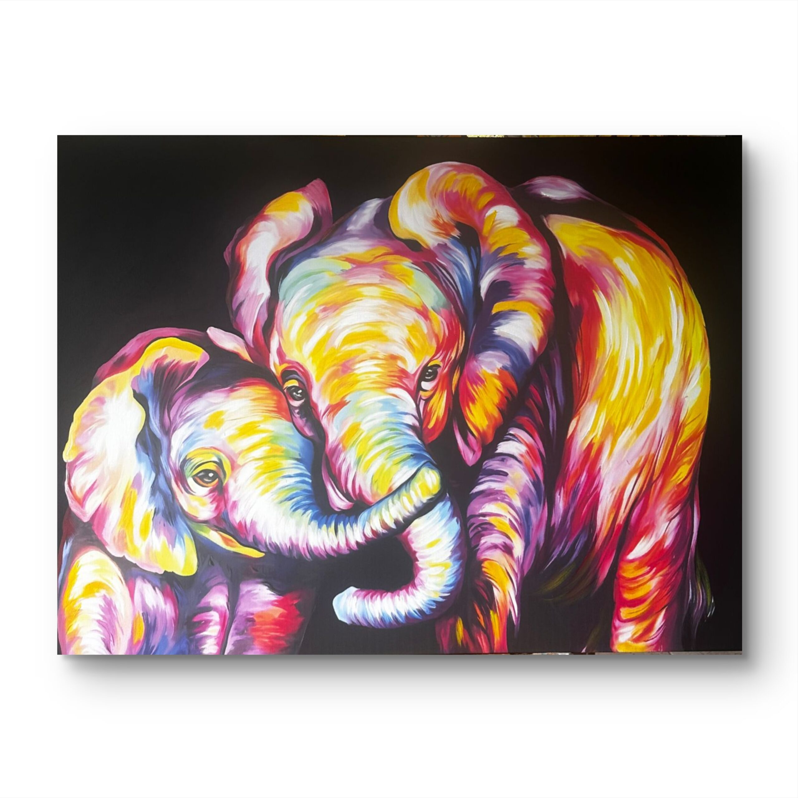 De estilo expresionista contemporáneo, la obra destaca por su paleta audaz de tonos magenta, amarillos y púrpuras sobre un fondo negro profundo que resalta el contraste. Las pinceladas gruesas y dinámicas crean una textura visual rica, simulando relieve y movimiento, mientras que el juego de luces intensifica la tridimensionalidad de los sujetos.