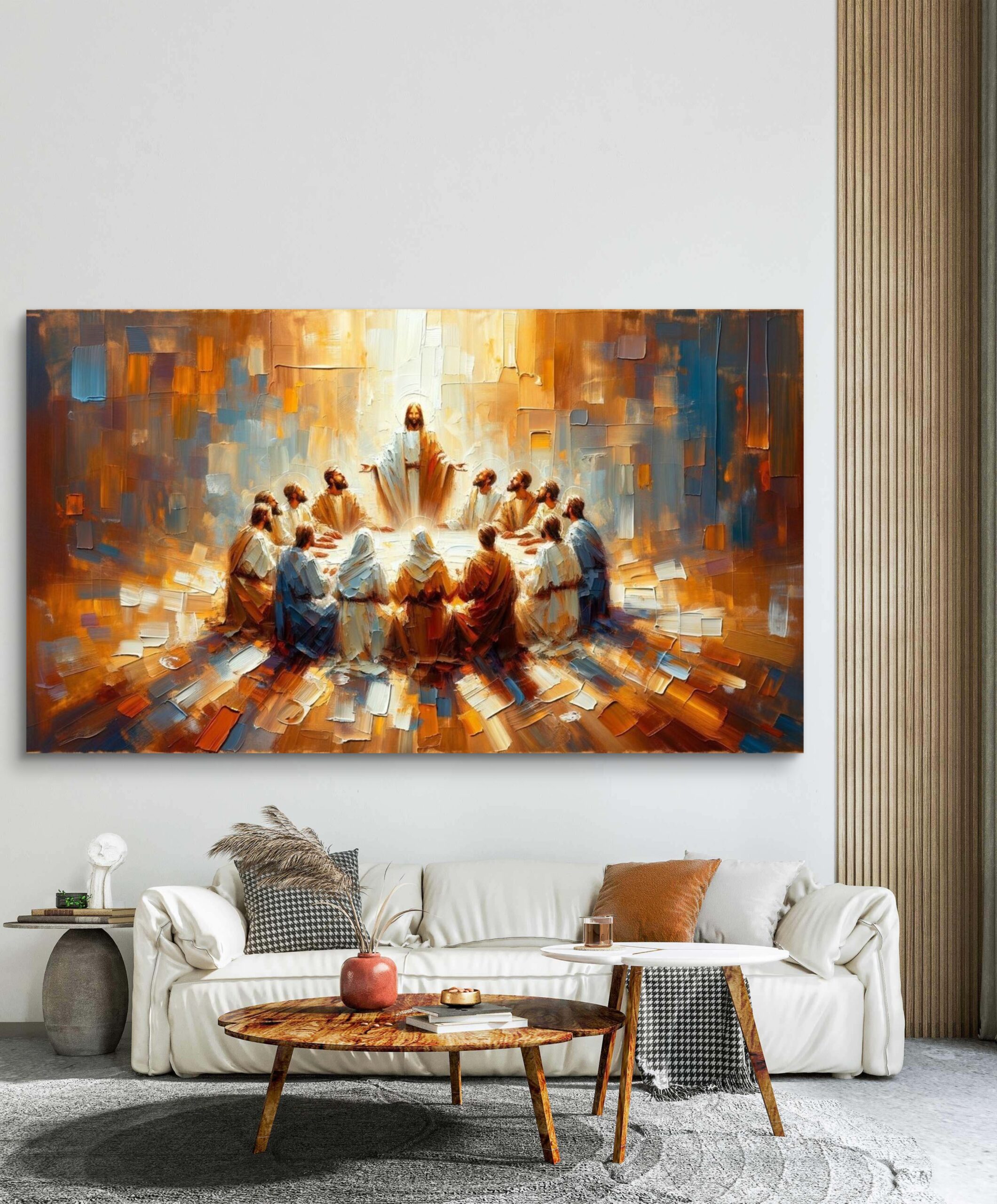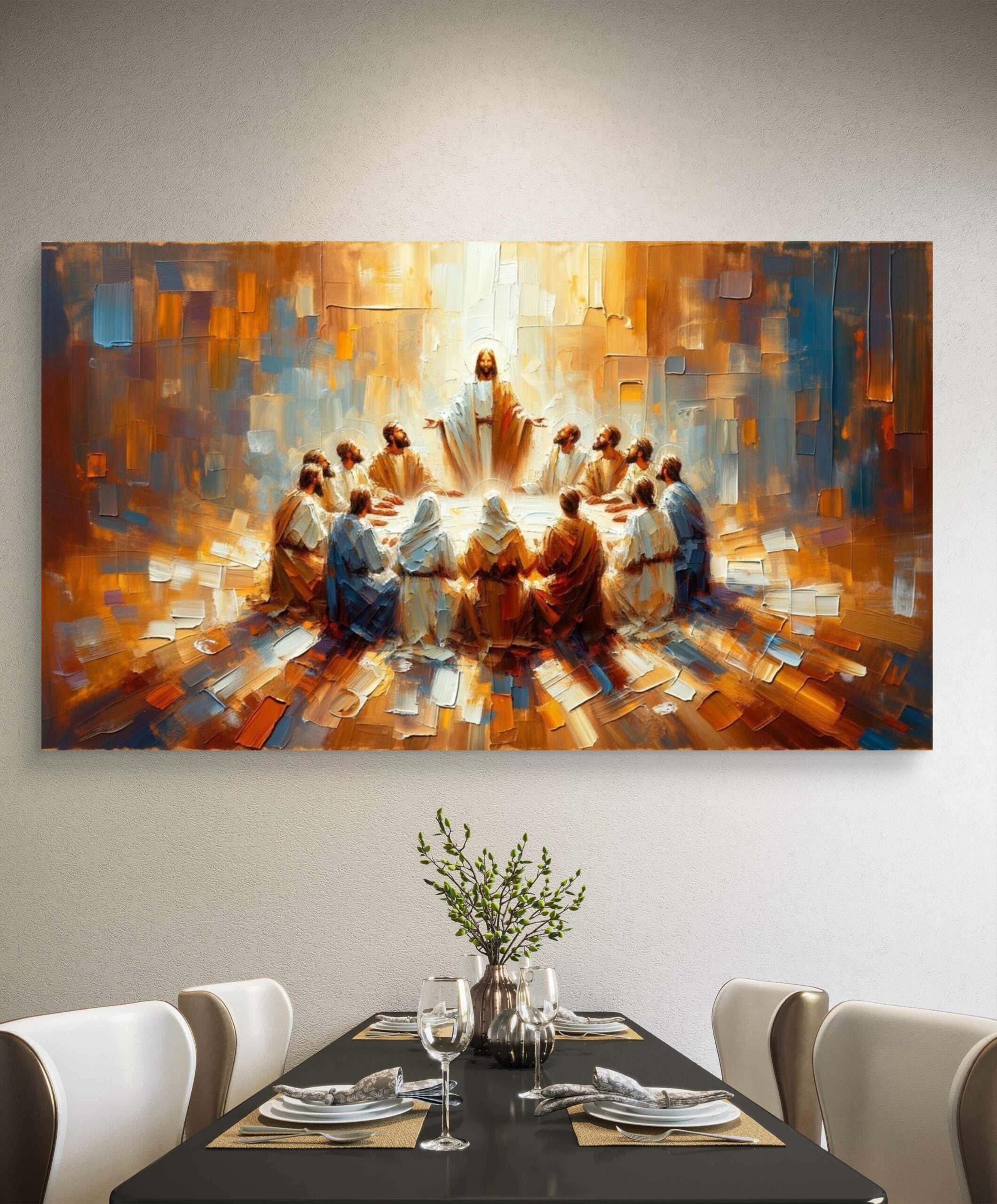 Esta última cena irradia una paz trascendental y una calidez envolvente que transforma cualquier estancia en un santuario de serenidad. Su atmósfera de luz divina fomenta la unidad y la introspección, convirtiéndose en el epicentro espiritual del hogar, elevando la energía del espacio con una elegancia serena y acogedora.